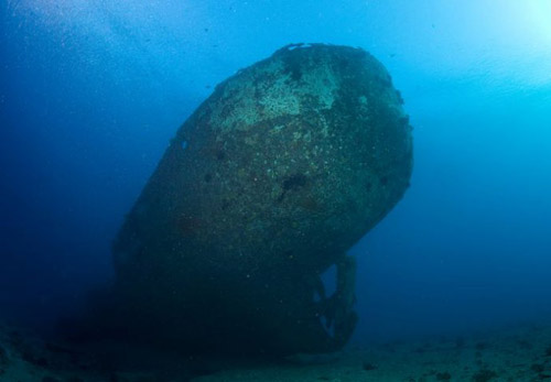 轻轻摆动着双蹼,紧紧跟着潜导,我仿佛像一条欢快的鱼儿遨游在碧蓝的大海里。未几,前方一座黑乎乎的大山挡住了我们的去路,游近一看,原来是一艘沉船,从外表看来,这是一艘废弃的渔船,这艘船还基本保持着原貌,只是锈迹斑斑的螺旋桨和船舵,还有长满了厚厚的海洋浮生物的船体,足以说明这艘沉船睡卧在海底已有若干年轮,这艘船不像是遇难沉船,因为海底没什么大的礁石可致使其触礁沉船,倒像是人们有意将废弃的渔船沉到海底以便为鱼儿造个安乐窝。船的上方还系着一个浮标,以此来指示航道。