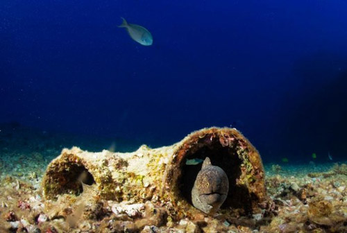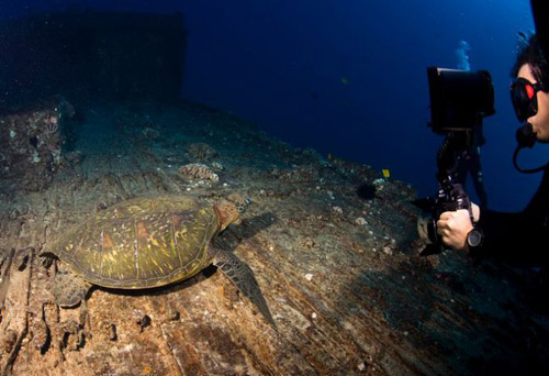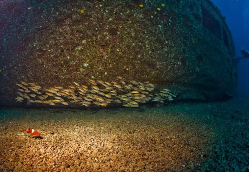 沉船的周围有一群红杉鱼在游弋;间或有些五彩的小鱼旁若无人地从船仓内游进游出;一只海龟静静地趴卧在船甲板上悠然自得,对于闯入牠领地的我们,海龟爱理不理。海龟是温和的海洋动物,望着我靠得越来越近的水下相机,牠似乎并不感到惊慌;倒是有一只海鳗躲在残旧的管道里,紧张兮兮地盯着外来者。