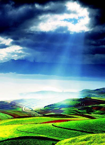 每年5月中旬左右,是麦子收割的季节。在半径范围为20公里的高低山坡之上,大地平缓起伏的线条有着绚丽广阔的色彩,衬以蓝天、白云和高原上瞬息万变的光线,构成了红土地上独有的景观。每一分钟你所看到的景色都会有所不同:前一分钟还是灿烂高阳,整个场景一片壮阔;后一分钟某块云团不期而至,挡住了部分光线,使得红土地光影交加,呈现出另一番景象。雨后彩虹也是红土地的常客之一,高原气候多阵雨,雨过天晴,你会在通透的蓝天上发现高挂着一条令人激动的彩虹。如果遇到云团厚实的日子,时不时会有一条难得的光柱从云雾缝隙之间穿梭而下,那束富有力量的光芒,打亮某块土地,鲜艳的色彩更是成为了画面中极具震撼力的焦点。