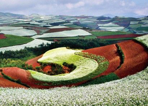 东川红土地指东川区新田乡花沟村花石头社方圆20公里左右的地域,这里地处乌蒙山区,海拔2000~3000米,属高原山区地貌,山岭纵横交错,红土丘陵一望无际。由于季节气候分明,在不同季节里村民会种植各种不同的农作物,洋麦花、荞子花、洋芋花、油菜花、萝卜花等。因此,在各个季节所拍摄到的画面色彩丰富。在高原变化不定的天气下,连绵起伏、大小不一的彩色山坡展示出一种天人合一的壮美景观。