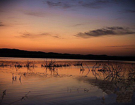 旭日东升,却被阻隔在沙丘一边,云彩、湖水、芦苇、湖面的枝条,顿时都被抚上一层祥光,渐次苇区越来越亮,一轮红日越过沙梁,无边无际的沙山犹如腰挂深蓝色的水腰带,向着一个幽长的沙漠峡谷淡出视野。