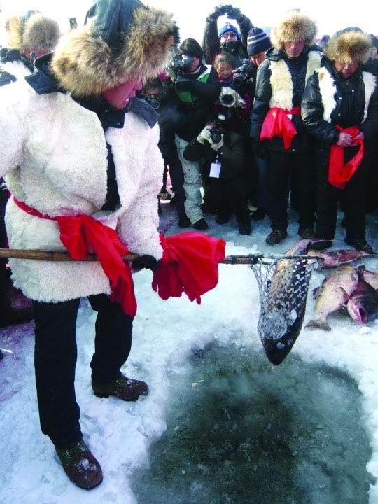 几 乎是一夜之间,柔美的镜泊湖便冻结成为一面“镜子”,这面镜子表面上平静如斯,冰面之下却是万鱼欢腾。牡丹江镜泊湖是世界上最大的火山熔岩堰塞湖,每年冬 捕之前都有一场声势浩大的“祭湖”仪式———祭祀湖神。这是当地民众以萨满族的仪式拜祭湖神,以求万物生灵永续繁衍,百姓生活吉祥安康。整个仪式非常严 肃、庄严,先是权威的大师宣读祭文,150名满族后裔身着满族传统服饰虔诚祭拜祈祷;然后萨满舞者跳起了满族特色的鞑子秧歌舞,渔工身着传统壮士服装饮壮 行酒,他们开启了一年中冬日的捕鱼大行动,而祭祀湖神意在感恩并且唤醒冬网,告知群鱼。只见千里冰封的湖面、鸣响起打鱼出征的号角,少数民族的热辣歌舞昭 示着冬日劳动的欢愉,在冰面上开个“冰窟窿”,开网捕鱼。