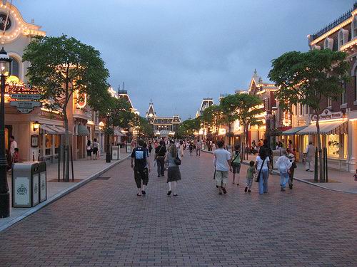 1890-1910年的美国,正处于新旧交替的年代,这时候,煤气灯逐渐被电灯淘汰;旧式马车亦被机动车辆及有轨电车取代。而19世纪未的新发现,更改变我们的在这个交接时期的生活方式。 ——华特迪士尼 美国小镇大街(Main Street U.S.A)是进入香港迪士尼乐园的起点;所有神奇的事情也在美国小镇大街开始,另外,这里也是进出乐园的地方。在美国小镇大街,在这里可感受20世纪初的美国风情,置身在这里,仿如时光倒流。在新旧时代交汇的十字路口上,古老公共汽车和汽车在道路上行驶,弥漫着美国的旧日古朴的小镇风情。在镇上有多间别贝特色的餐厅和商店。